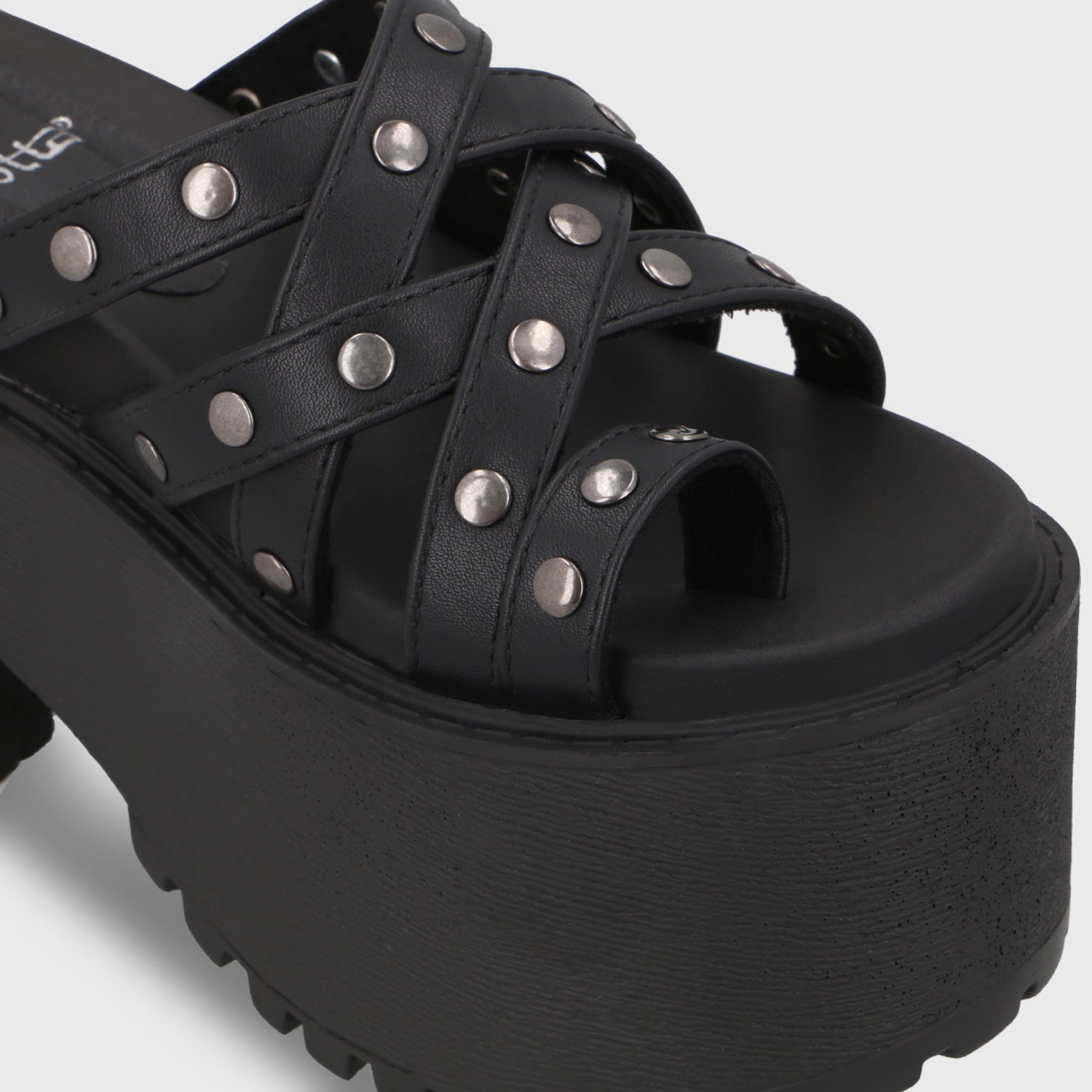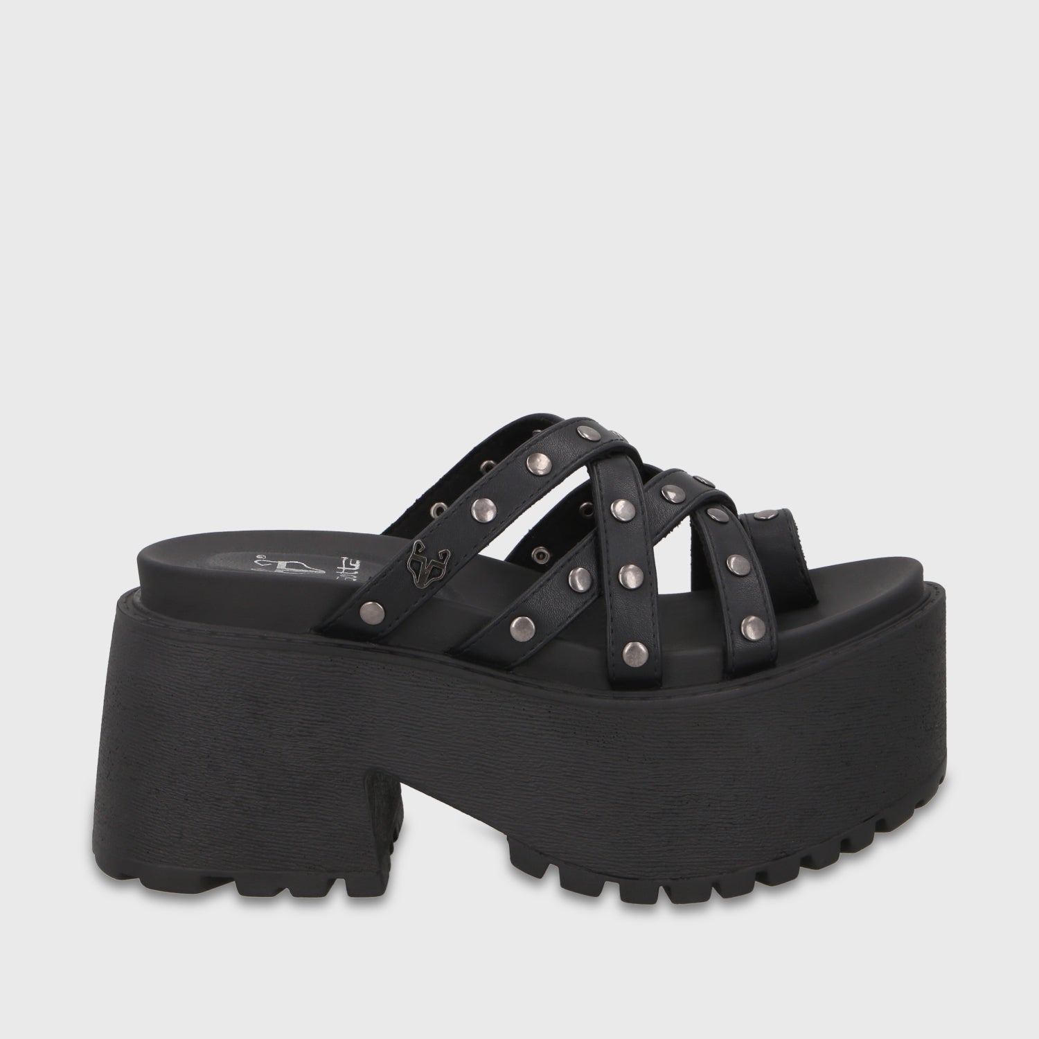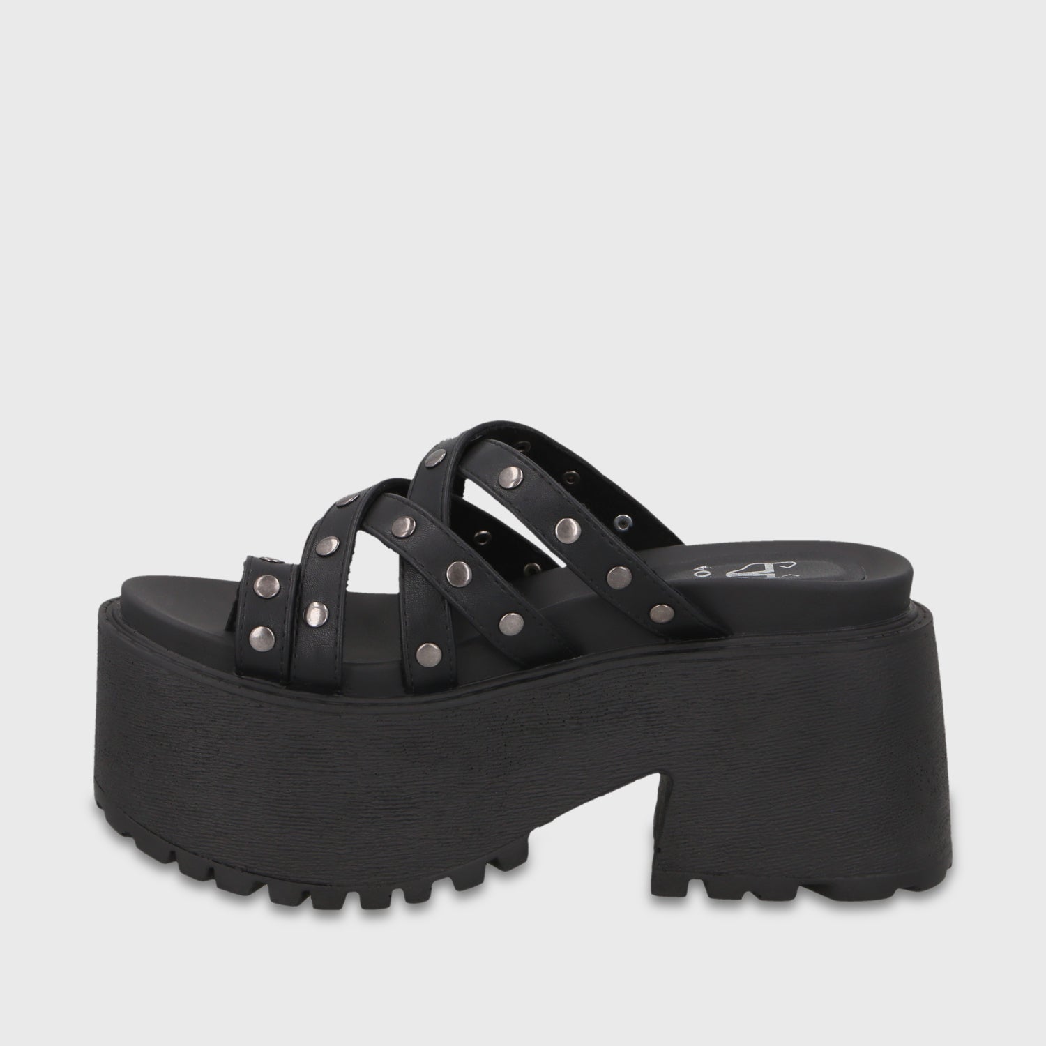 Sandalias de plataforma negra con tiras gruesas y detalles metálicos. Audaces y llamativas. ¡Haz que cada paso grite personalidad! Tip de estilo: Úsalas con vestido vaporoso para contraste.