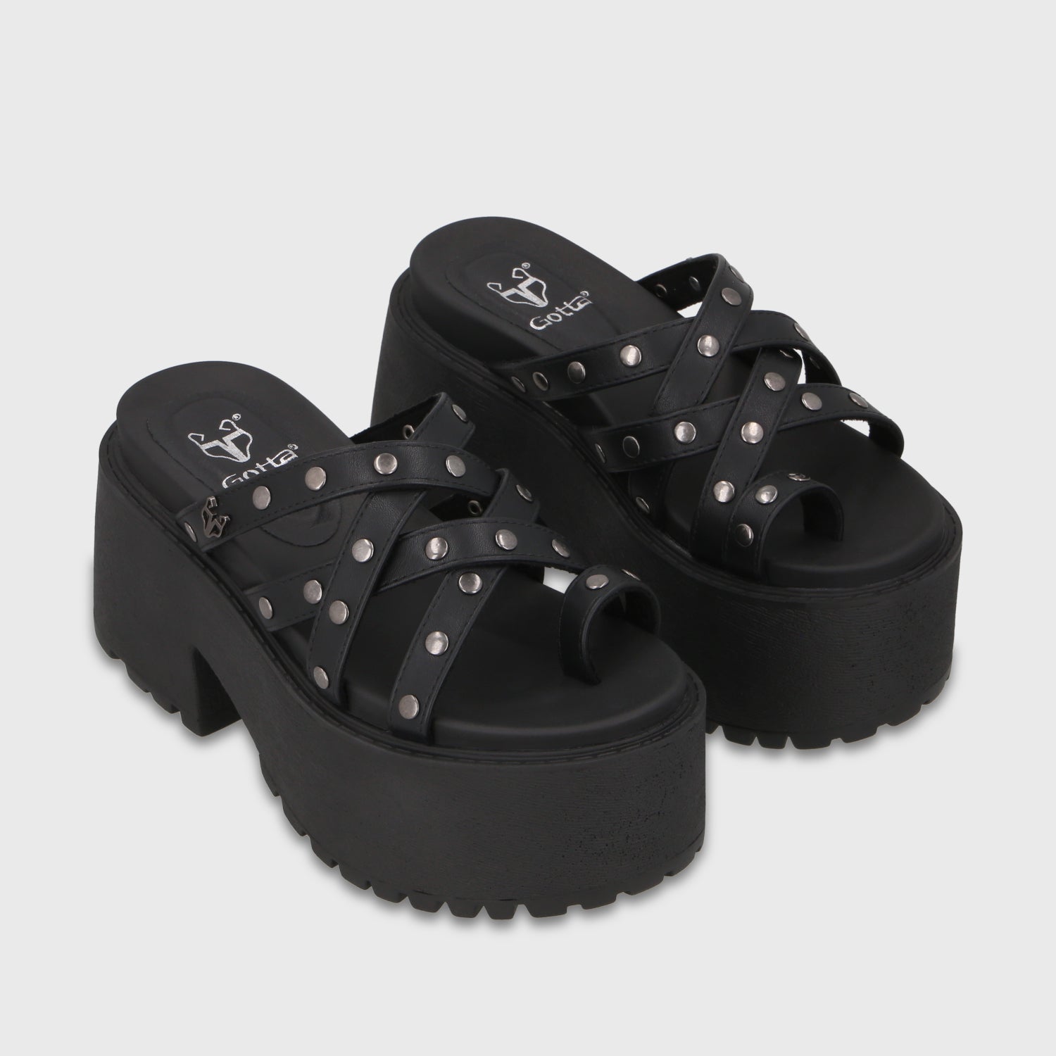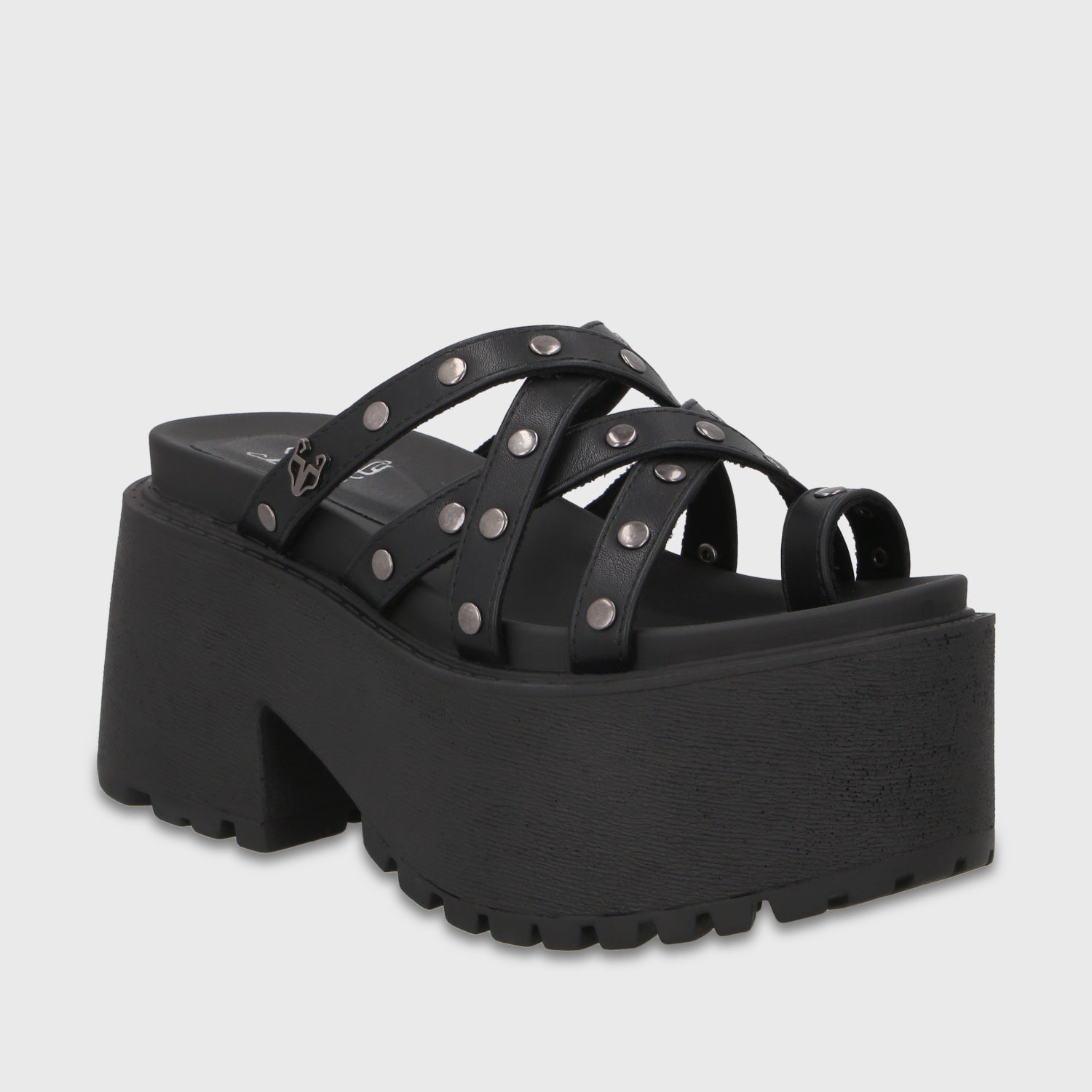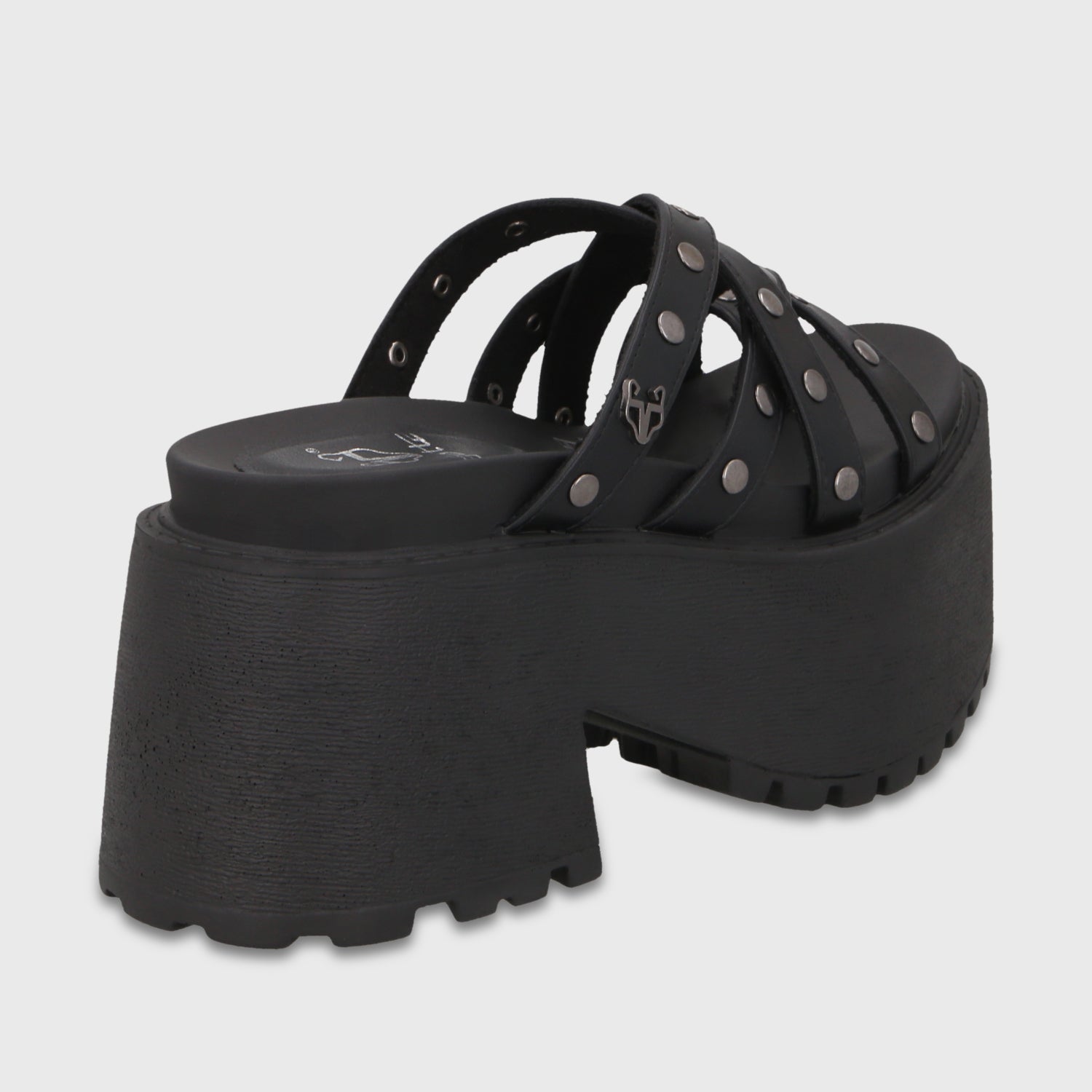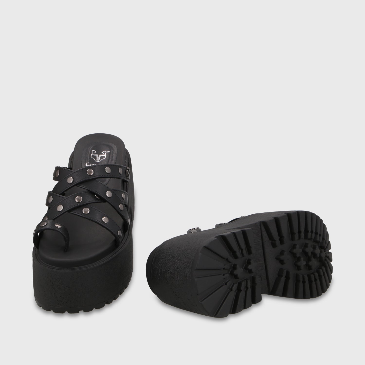 Sandalias de plataforma negra con tiras gruesas y detalles metálicos. Audaces y llamativas. ¡Haz que cada paso grite personalidad! Tip de estilo: Úsalas con vestido vaporoso para contraste.