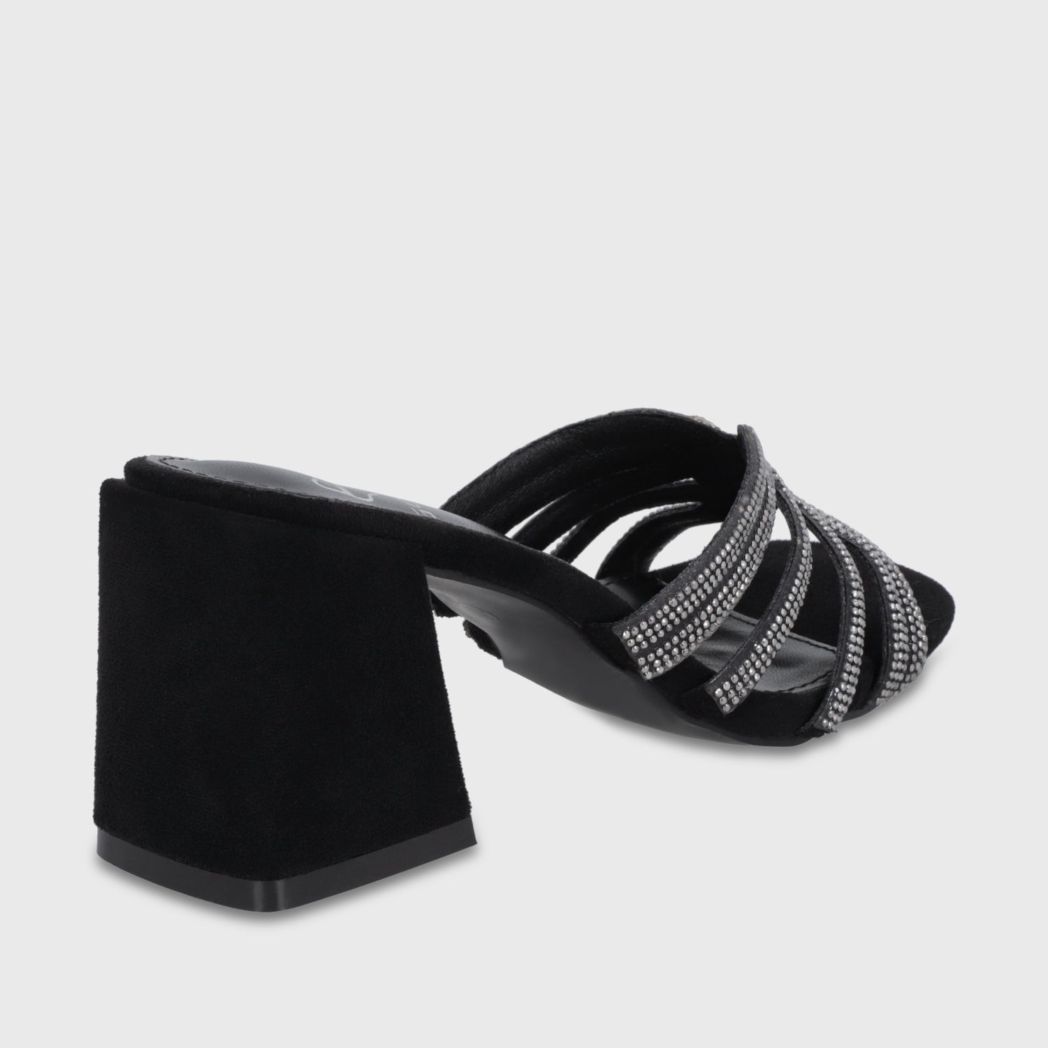 El negro siempre será un clásico, y en esta sandalia de gamuza con cristales encuentra su mejor versión para darle un aire sofisticado a tus looks de fiesta o a un outfit urbano con mucho estilo. Su diseño con taco y punta cuadrada estiliza la silueta, mientras que la textura en gamuza aporta elegancia atemporal. Combínalas con un vestido lencero, una falda satinada o un pantalón sastre para un giro moderno y fashionista.
